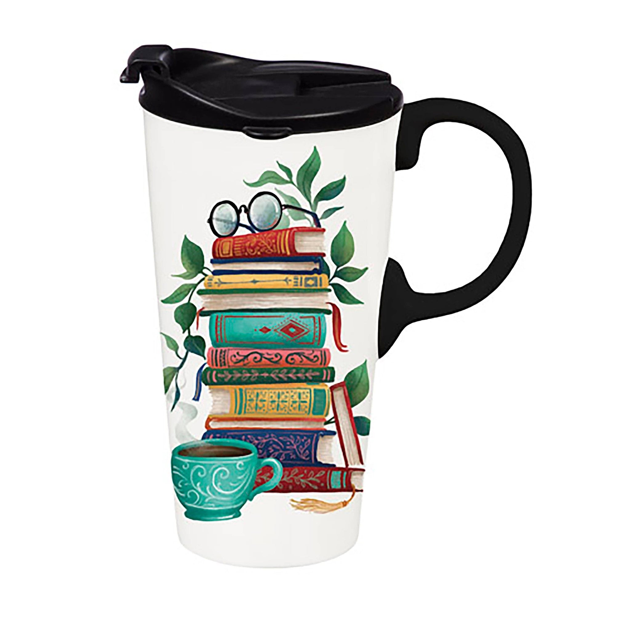 Too busy to sit down and enjoy a cup of coffee? No problem. This travel cup is ready for adventure. Perfect for an on-the-go lifestyle, this travel cup is a top seller and fan favorite. Crafted from durable ceramic, the mug is covered in charming artwork and holds up to 17 ounces of any beverage. Its three-ring silicone lid fits perfectly into the cup's molded grooves for added security. For quick cleaning and reheating purposes, it's top-rack dishwasher safe and can be microwaved. The cup comes packaged in a beautiful coordinating gift box.