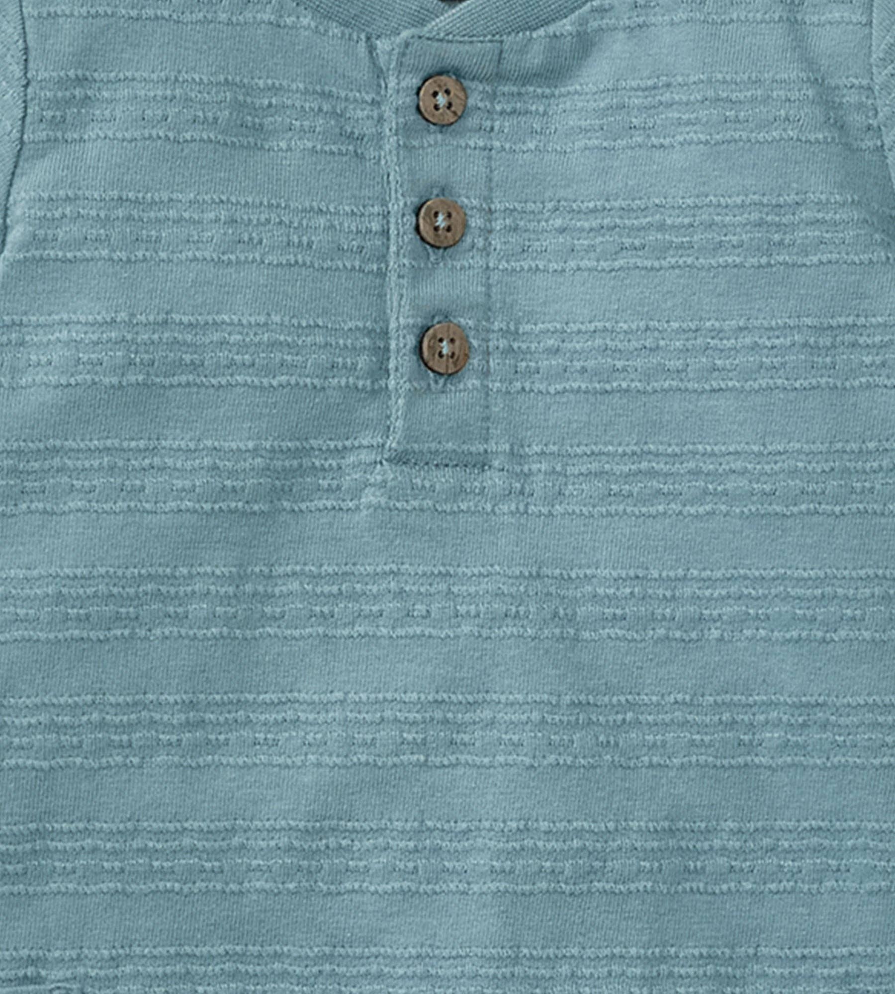 Comfy, cool, and casual in this henley jumpsuit! Short sleeve jumpsuit Super soft cotton Henley jumpsuit with three buttons at front placket Oversized pockets at hips Cuffs at leg opening 100% Organic Cotton Made in India
