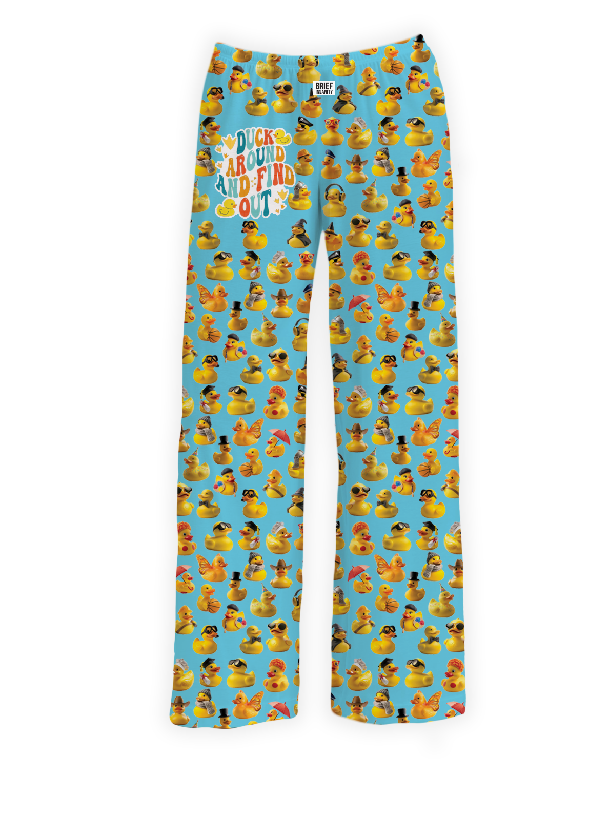 BRIEF INSANITY's Duck Around pajama lounge pants for 2025. Ready to make a splash? These "Duck Around and Find Out" pajama lounge pants are here to ruffle feathers and crank up your cozy game! Featuring an all-over quirky duck print and a cheeky statement that’s sure to make everyone smile, these pants are the ultimate combo of playful and comfortable. 🦆