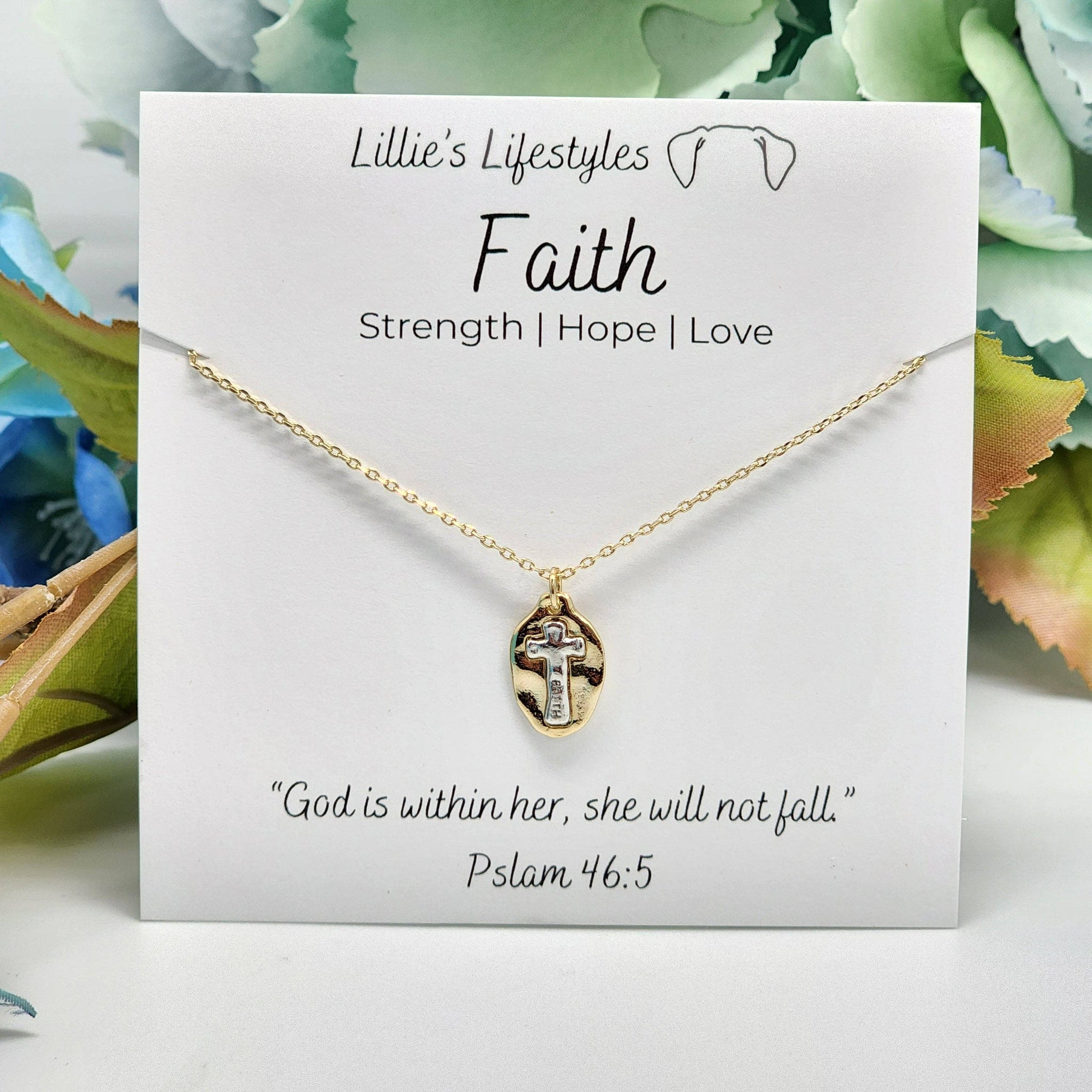The Faith Two Tone Cross Necklace from Lillie's Lifestyles is a pretty statement of faith you will want to wear everyday. The Faith Pendant represents Strength, Hope and Love “God is within her, she will not fall.”