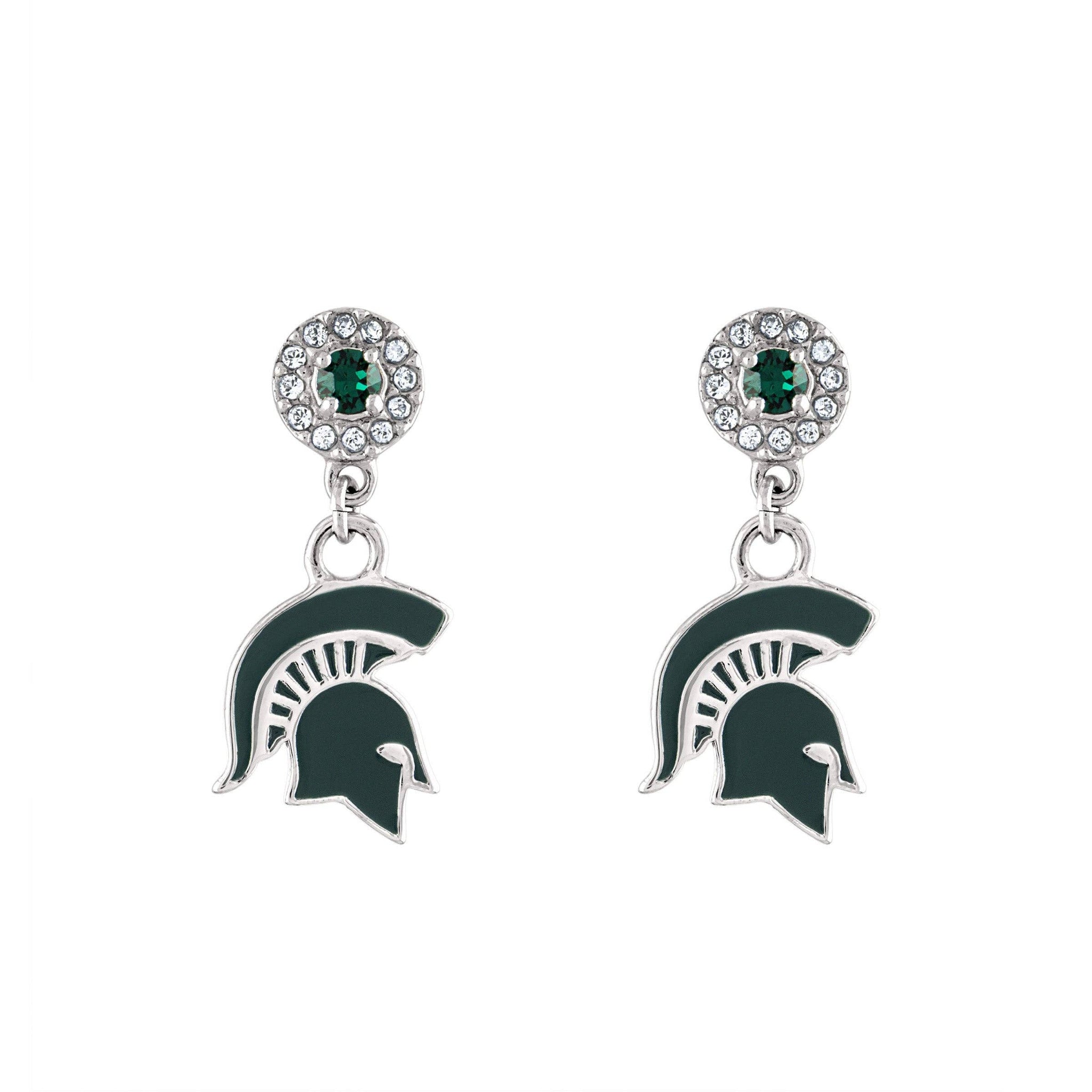 Stone Armory's Michigan State drop earrings are here! Gear up for the game with our beautifully designed Michigan State Spartans earrings! Wear them to your next tailgate or around town to show off your Michigan State University pride. These stainless steel MSU earrings would also make the perfect Michigan State gift for your favorite Michigan State Spartans fan! The Michigan State logo is accented by sparkling green and clear crystals. Stone Armory's MSU jewelry is made of stainless steel and carefully designed, making these NCAA Michigan State drop earrings the perfect gift to celebrate Michigan State graduation, birthdays, Mother's Day, first day of school, the first game, or for everyday fan wear.